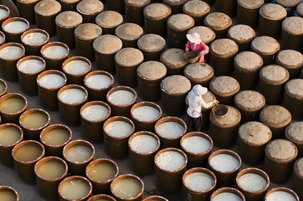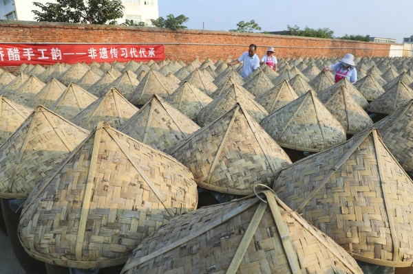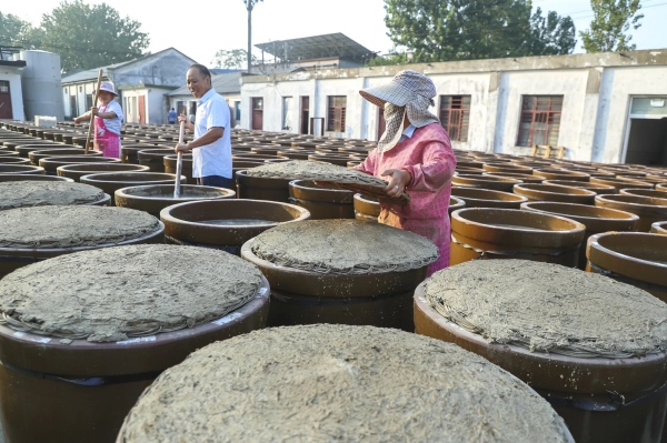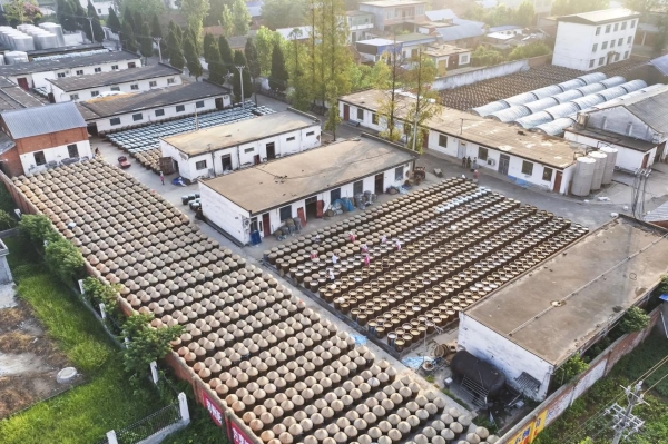晒场上,大伙分工明确,装缸、加曲、搅拌、用特制泥巴封缸……汗珠砸在水泥地上瞬间蒸发?!霸饺仍匠龊么?!”50多岁的非遗传承人、厂长翁泽彬抹了把汗,指着整齐排列的醋缸说。今年头伏,他们一口气新增了1000多口缸,总数突破3000缸。工人们三班倒,日夜不停地煮料、搅拌,最后用当地特制的泥巴仔细封缸,盖上篾盖。